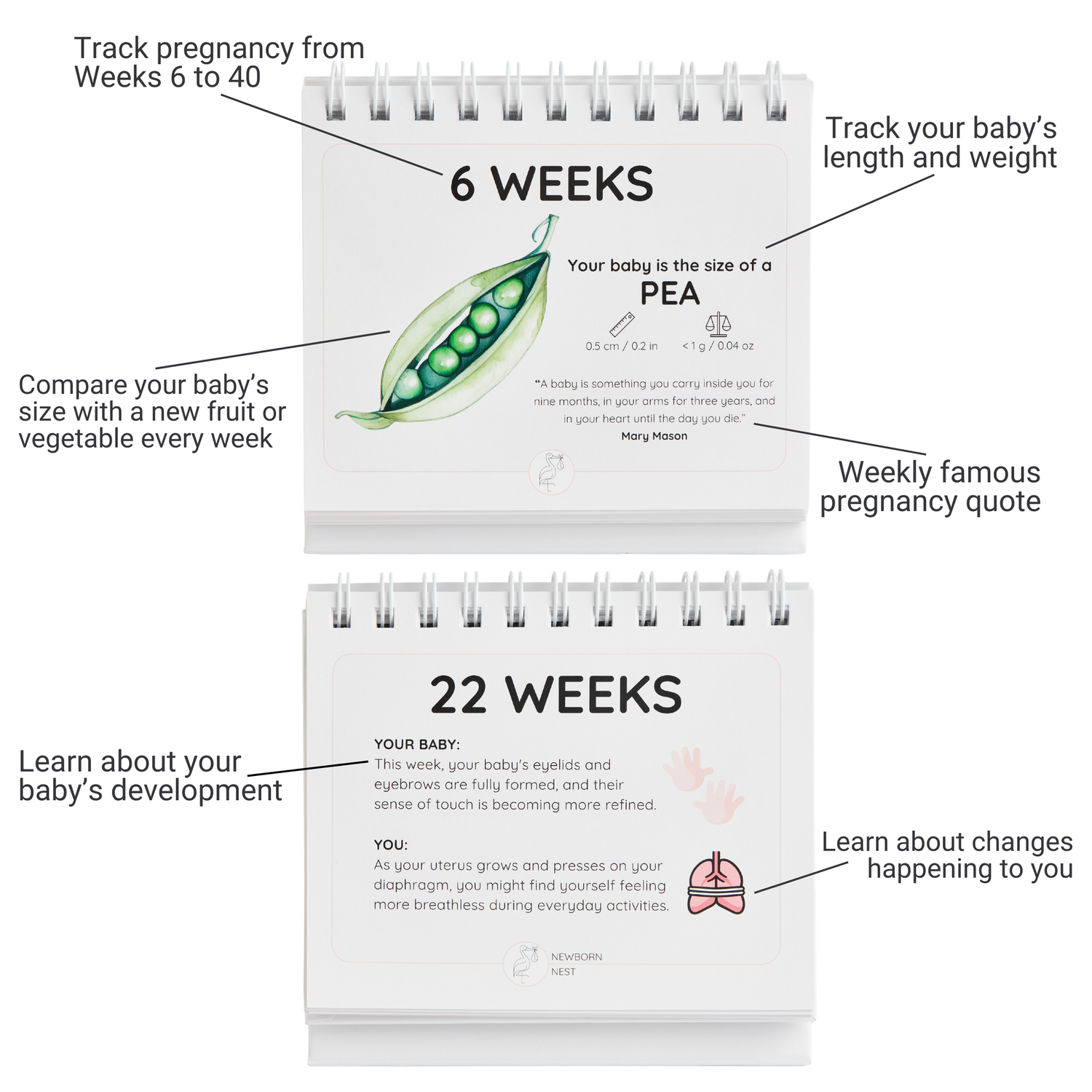 From week 6 through to week 40, track your baby’s growth, enjoy uplifting quotes, and discover what’s happening inside and out— all in one beautiful keepsake. A gift for you, or someone you love.
